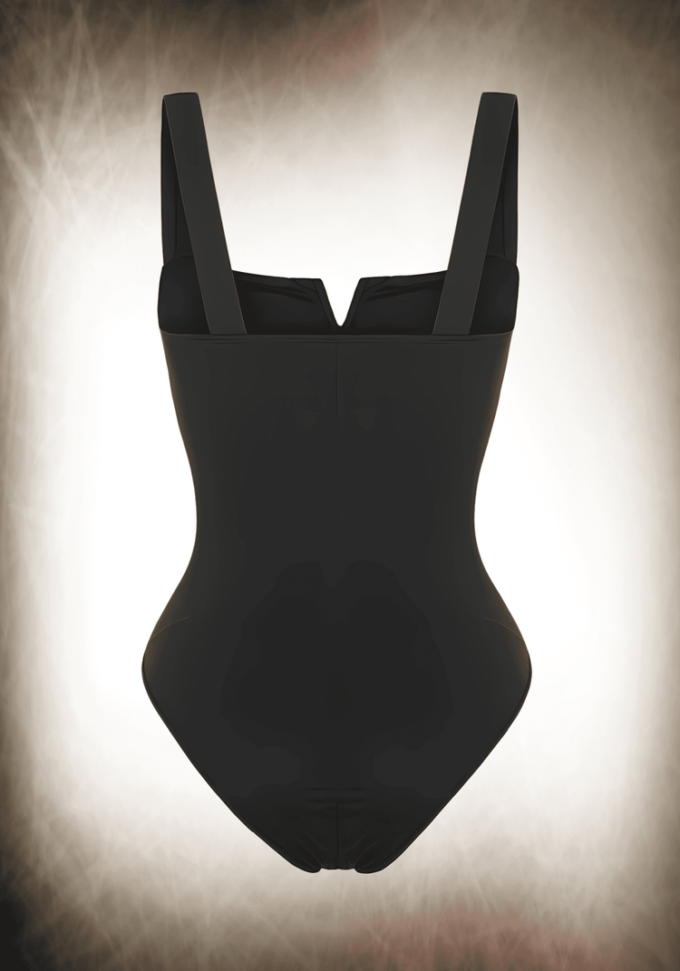 ‣ Stretchy knit shapes this sleeveless bodysuit with wide straps supporting a square neckline with a sexy notched detail (supported by an internal U-bar) at the centre.